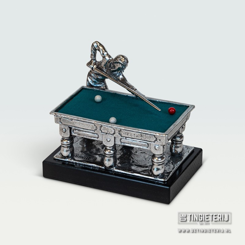 Diese detailreiche Zinnminiatur zeigt einen Billardspieler in Aktion an einem klassischen Billardtisch mit grüner Filzoberfläche. Sie ist ein ideales Geschenk für Billard- oder Snooker-Fans oder als Trophäe oder Turnier-Requisite im Billardclub.