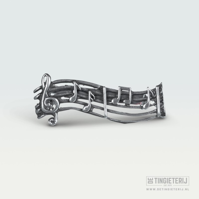 Prachtige tinnen broche in de vorm van een notenbalk, geleverd in luxe geschenkverpakking.
