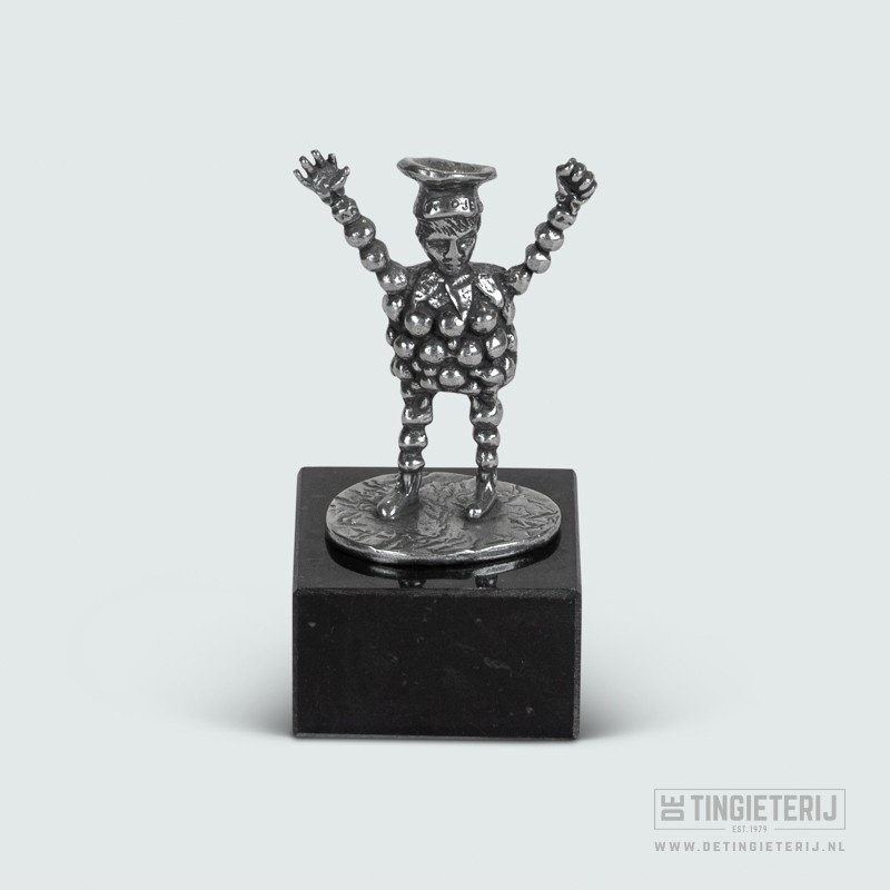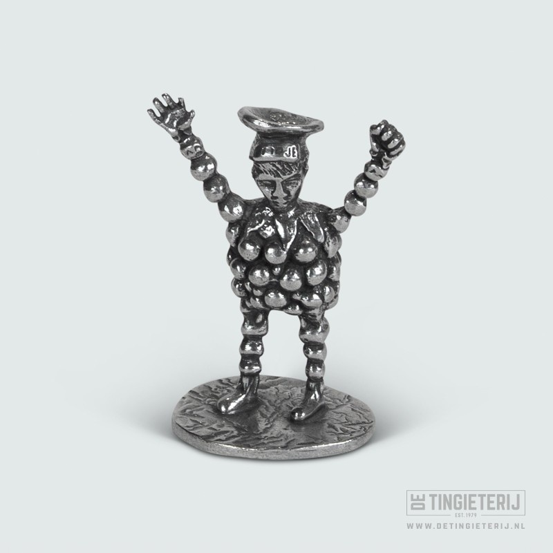 Ambachtelijk gegoten tinnen Flipje beeldje met handen in de lucht. Speels en iconisch miniatuur, perfect als decoratie of origineel cadeau. Lees meer