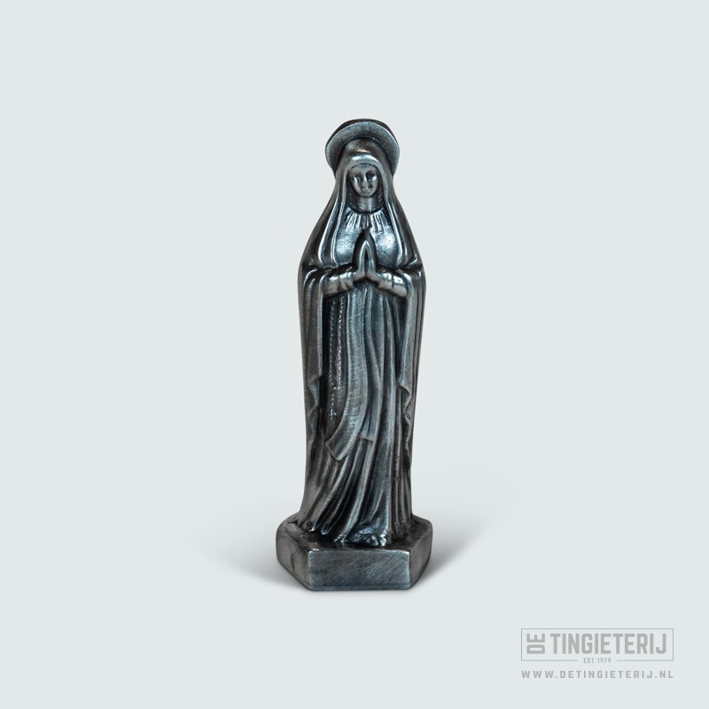 Een prachtig sculptuur van de heilige Maria, staande op een voetstuk met de handen ineengevouwen.