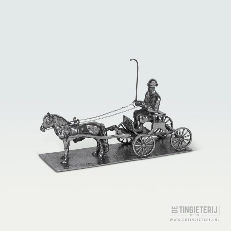 Een gedetailleerd tinnen beeldje van een menner met paard en wagen. Handgemaakt en voorzien van alle details. Een prachtig cadeau voor een paardenliefhebber of als prijs / trofee in de paardensport.