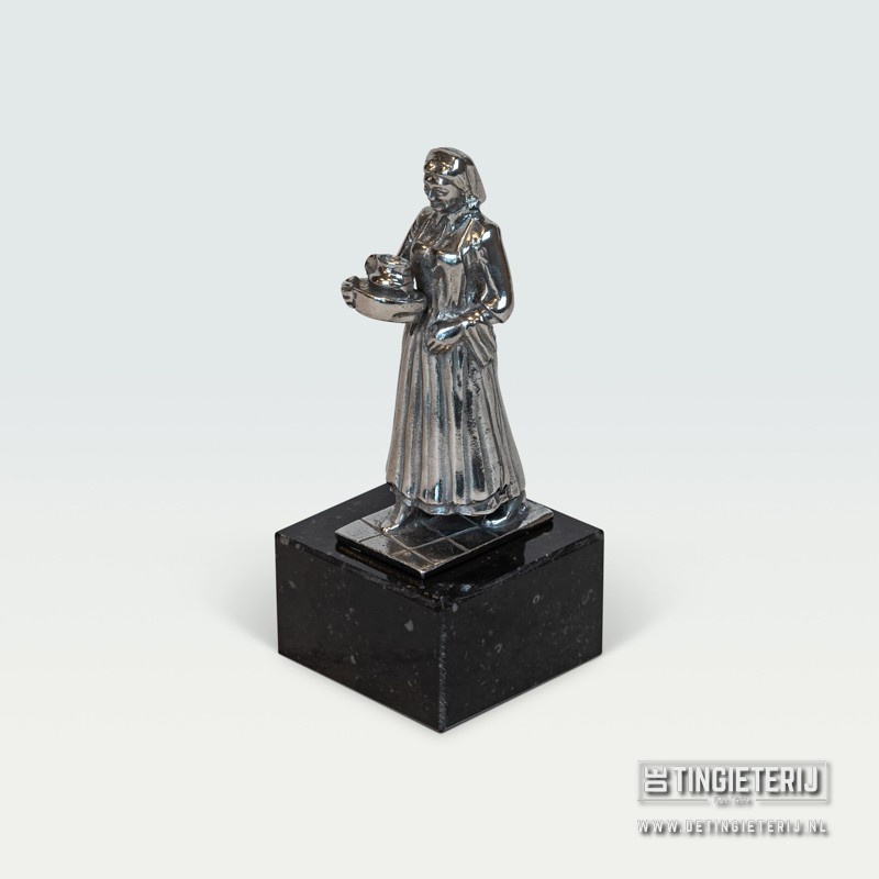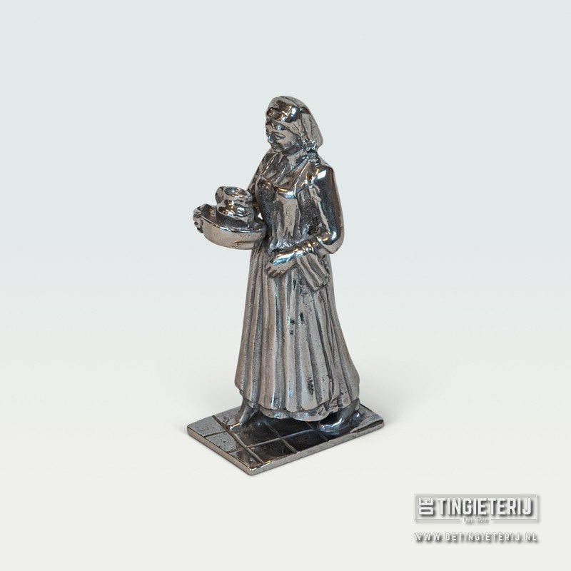 Dit gedetailleerde tinnen beeldje stelt een klassieke verpleegster voor in traditioneel uniform, met een dienblad in haar handen. Een prachtig vormgegeven miniatuur dat symbool staat voor zorg en toewijding.